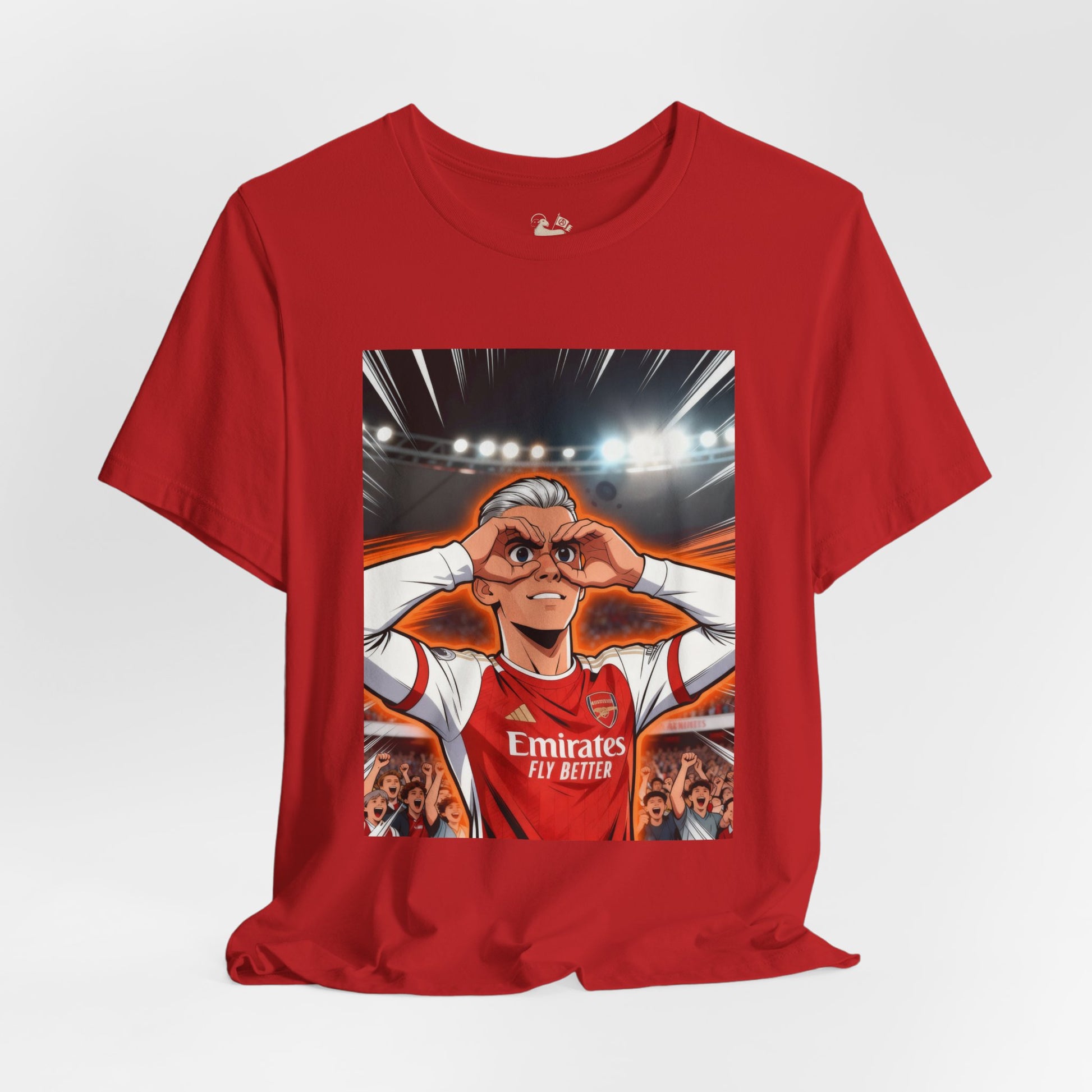 A nod to those who reject the predictable and embrace the iconic — just like Trossard’s celebration rejects the everyday, and someone like Anne Hathaway wearing the Arsenal colours rejects the plain.