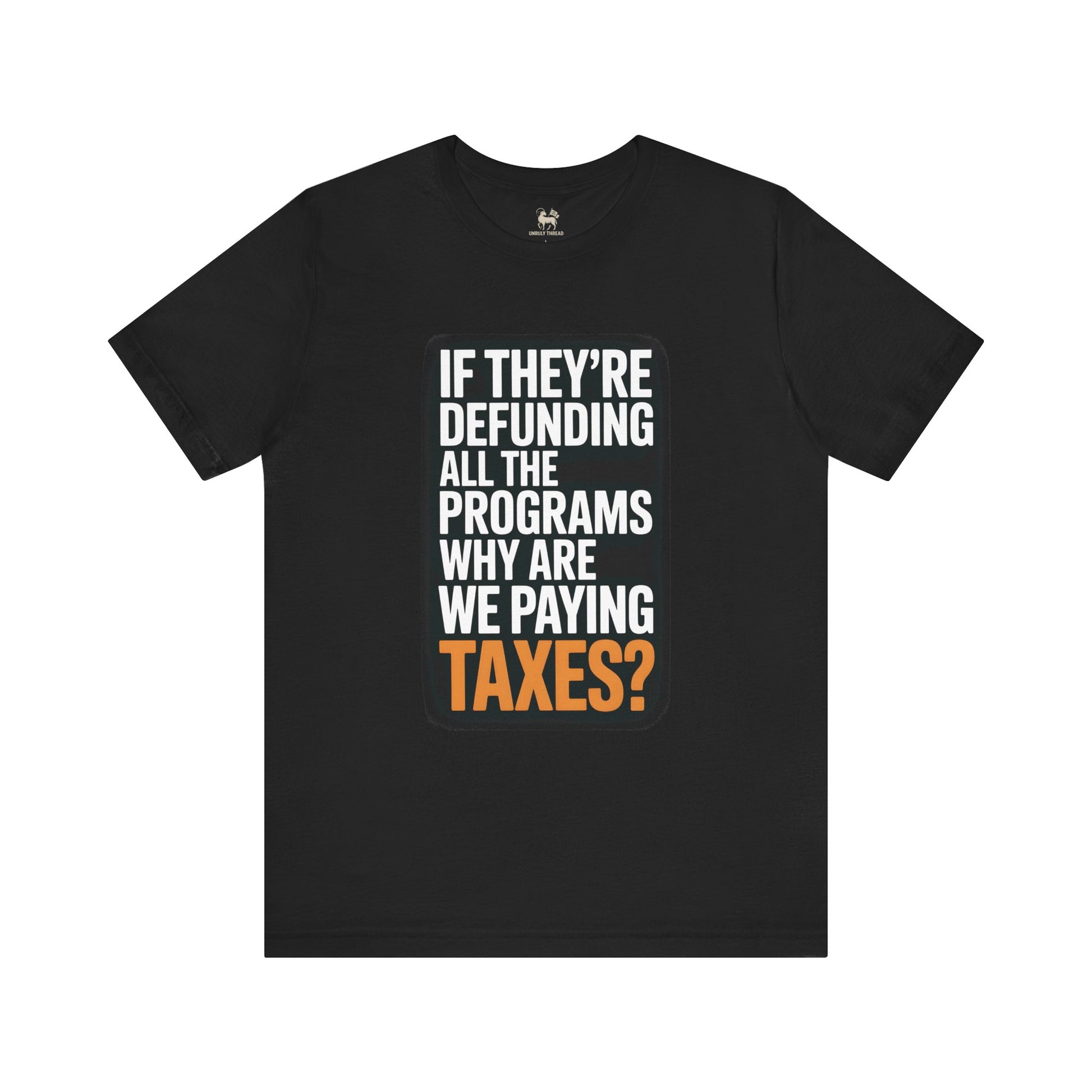 The Unruly Thread “If They’re Defunding All the Programs Why Are We Paying Taxes?” Tee is a sharp, minimalist protest shirt built on the premium Bella + Canvas 3001—soft, lightweight, and made for everyday rebellion.