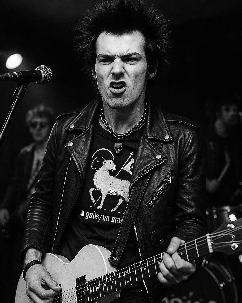 The No gods / No masters design features a two-headed lamb—one light, one shadow—stepping forward beneath a halo and hoisting a flag marked with the anarchist symbol. The lamb, a figure of supposed purity and obedience, is reclaimed here as a creature of contradiction and strength. It walks not in submission, but in defiance.